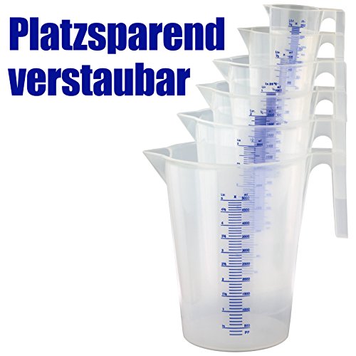 Damit wird das Kunststoff Messbecher-Set für lange Zeit zu Ihrem zuverlässigen Freund und Helfer in der Küche, aber vor allem auch in Werkstatt, Garage, Labor und Industrie.