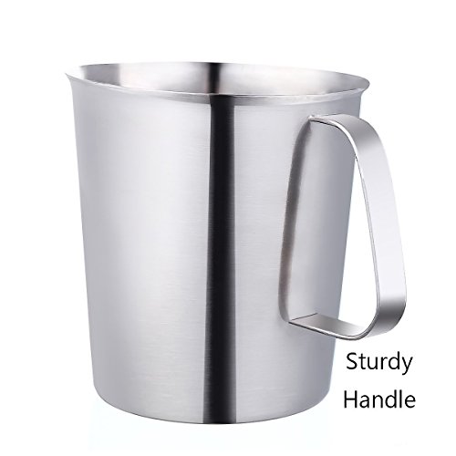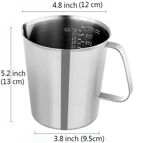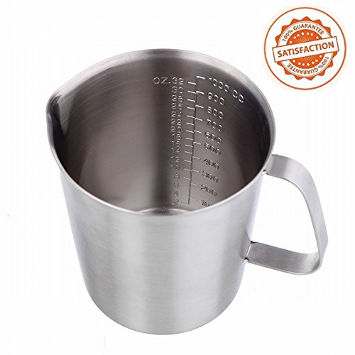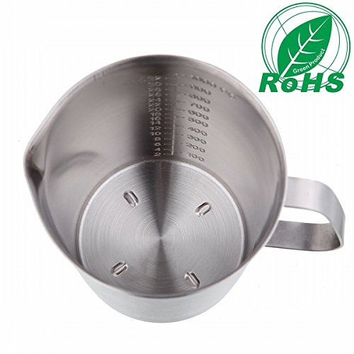 Das ist ein Messbecher mit Skala der 2 Normen. Ein Messbecher aus Edelstahl mit Kapazität von 1000 ML kann Ihnen helfern, um besseres Getränk vorzubereiten.